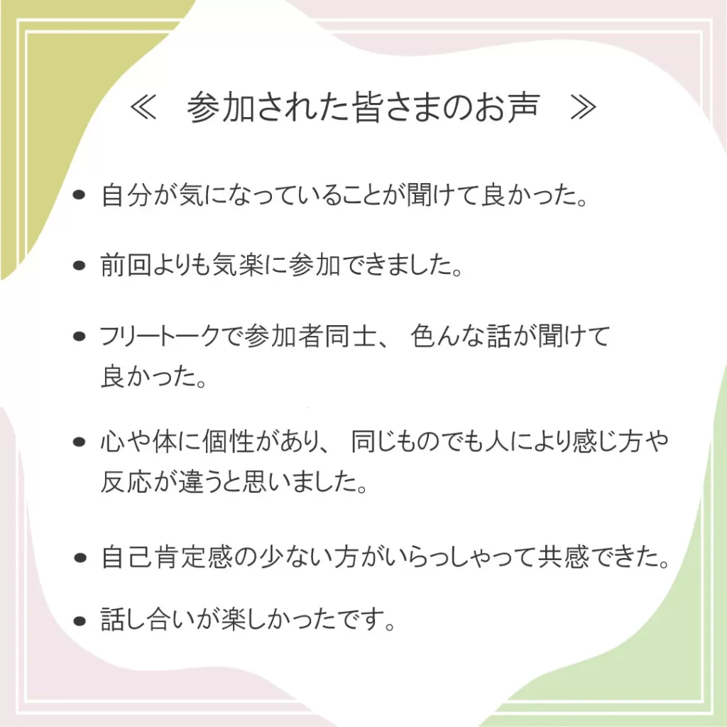11月に開催した繊細さんの居場所であるセンサイ会議ですが、今回も穏やかな雰囲気の中で自分にやさしく向き合う時間…でした。