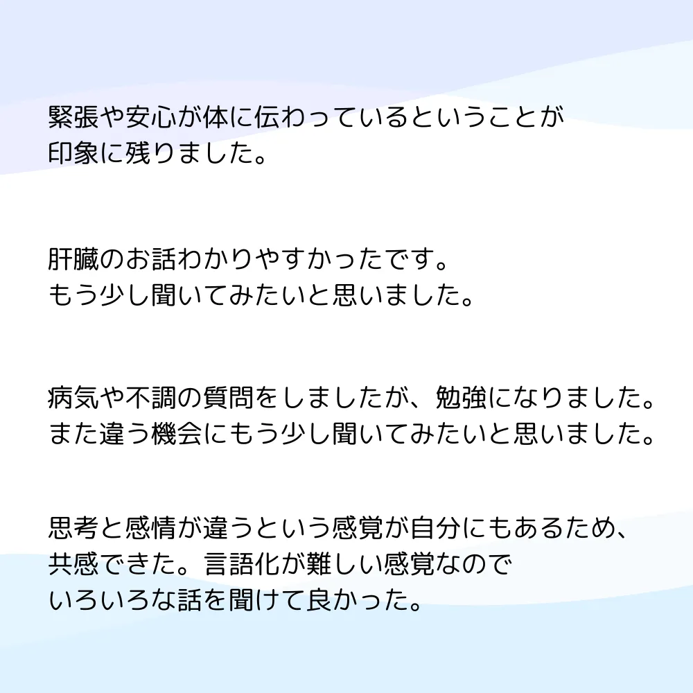 センサイ会議では、こうした体と心のつながりをやさしく少しずつ学び合いながら、安心できる時間を積み重ねています。