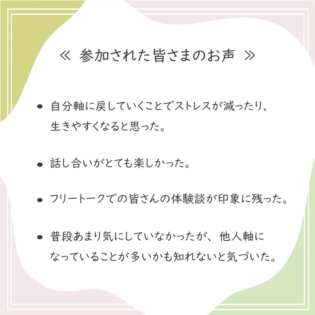 今回のテーマである「自分軸」ネガティブに捉えやすかったり、ひとり反省が多い、流されやすいなどetc